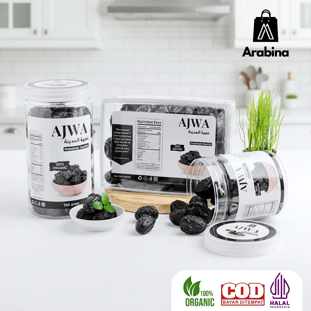 Kurma Ajwa 100% Original Organik Premium Azwa Madinah Lembut Legit. Menjaga tubuh dari racun, sihir, kuman dan penyakit cacing pita. Mengkonsumsi 7 butir ajwa setiap hari selama 1 bulan penuh dapat menyembuhkan penyakit hati.